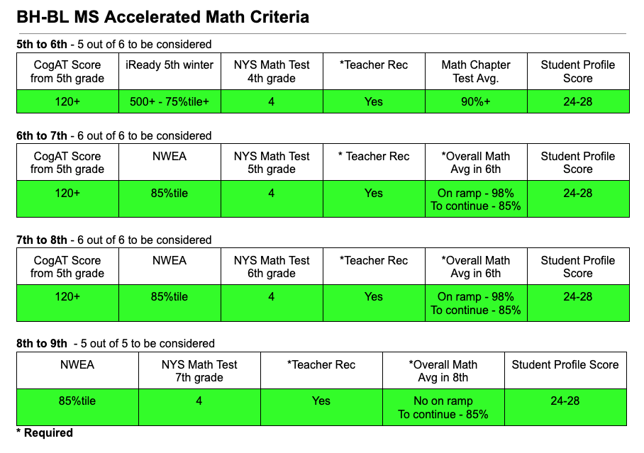 Combined assessment and student profile criteria to be considered for math and accelerated math are include here: