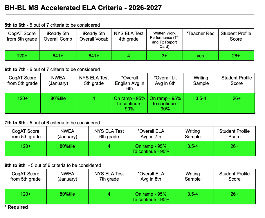 While many students begin taking advanced coursework in ELA and math in grade 6, some students may demonstrate this potential further along their middle school experience.  If your child’s teacher recognizes this potential they will have the opportunity to meet certain criteria to move into the corresponding courses during 6th, 7th or even 8th grade.  To be considered students must be recommended by their teacher and meet the criteria for their grade level explained in the above section. Contact the appropriate subject area administrator if you have additional questions.